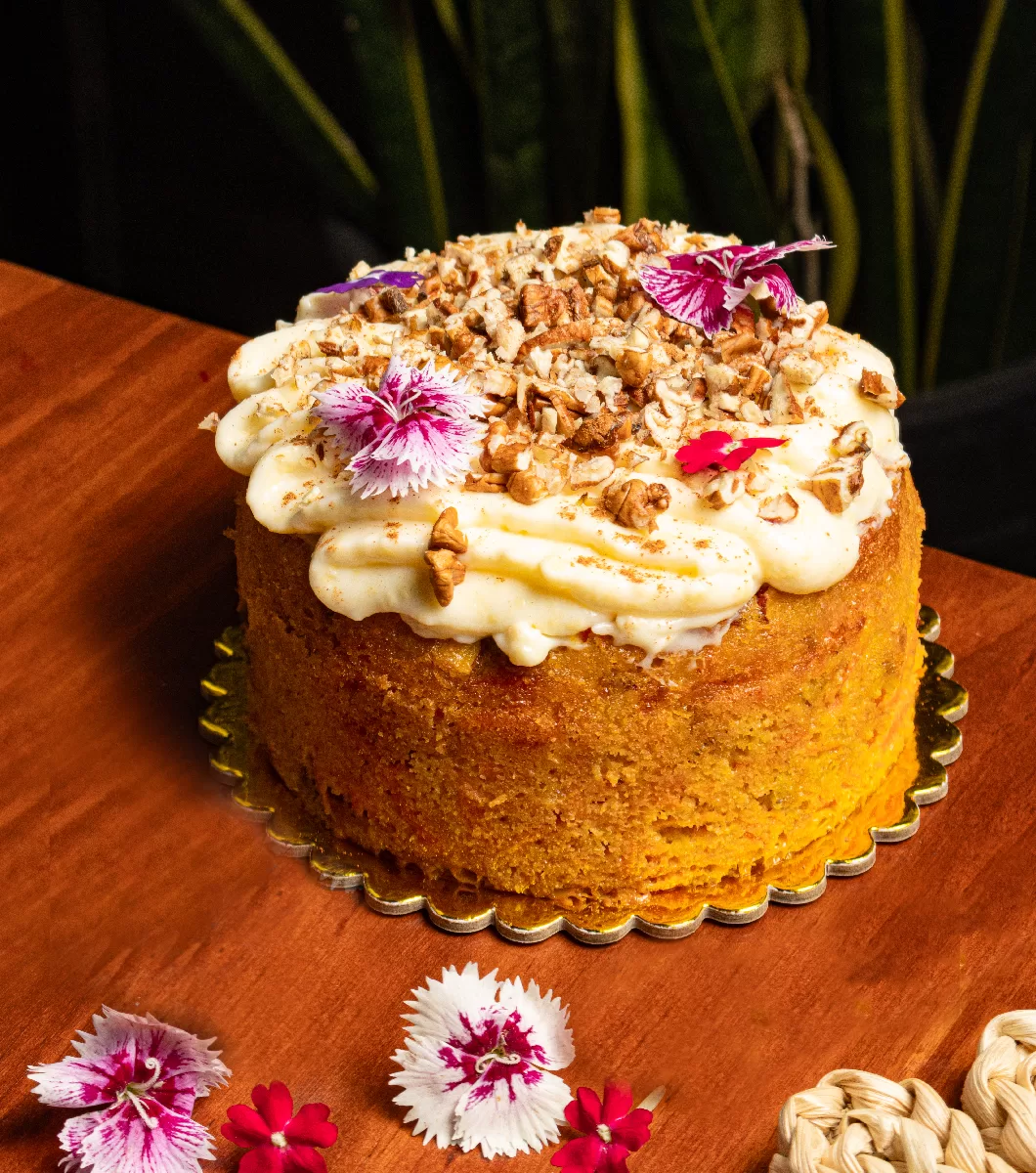 Elaborado con harina de almendras ,aceite de coco , zanahorias, huevos de corral , pecanas y queso crema.