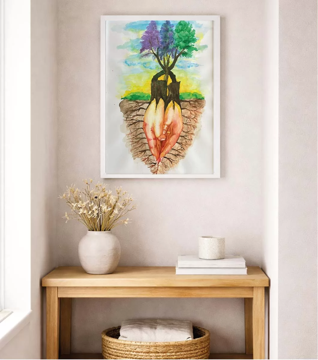 Este cuadro representa a nuestros ancestros: sus raíces, su historia y su entrega. Ellos parten, pero no desaparecen; se transforman en el suelo fértil desde el cual seguimos creciendo.